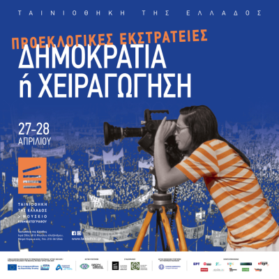 Στις 27 και 28 Απριλίου, η Tαινιοθήκη της Ελλάδος και η Eλληνική Εταιρεία Πολιτικής Επιστήμης παρουσιάζουν το αφιέρωμα "Προεκλογικές Εκστρατείες: Δημοκρατία ή Χειραγώγηση". Μια κινηματογραφική περιήγηση στην μετεξέλιξη των προεκλογικών εκστρατειών στην επαρχία και στις γειτονιές της Αθήνας, από το 1974 έως το 2012.