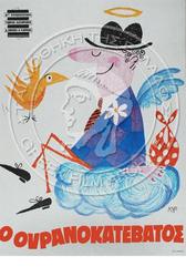 Πολύχρωμη αφίσα με σχέδιο του ΚΥΡ. Ένας άνδρας προφίλ, με μεγάλη μύτη και καπέλο, κάθεται σταυροπόδι πάνω σε ένα σύννεφο. Φέρει γαλάζια φτερά και φωτοστέφανο, φορά πολύχρωμο κοστούμι με ένα λουλούδι στο πέτο, και χαμογελά ευτυχισμένος. Μπροστά του πετά ένα πουλί. Κάτω από την εικόνα αναγράφεται, κάπως ακανόνιστα, ο τίτλος με κόκκινα κεφαλαία γράμματα, πάνω στο λευκό φόντο της αφίσας: Ο ΟΥΡΑΝΟΚΑΤΕΒΑΤΟΣ. Άνω αριστερά σημειώνονται οι παραγωγοί: «Αφοι Ρουσσόπουλοι, Γιώργος Λαζαρίδης, Δ. Σαρρής, Κ. Ψαρράς». Στο κάτω μέρος της εικόνας, η υπογραφή του καλλιτέχνη: ΚΥΡ. Στο περιθώριο της αφίσας: «Εκτυπ. Ν. Ζαφειρόπουλος».