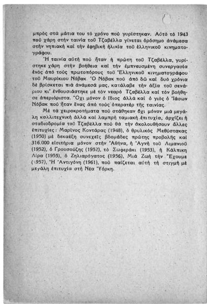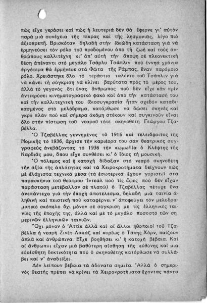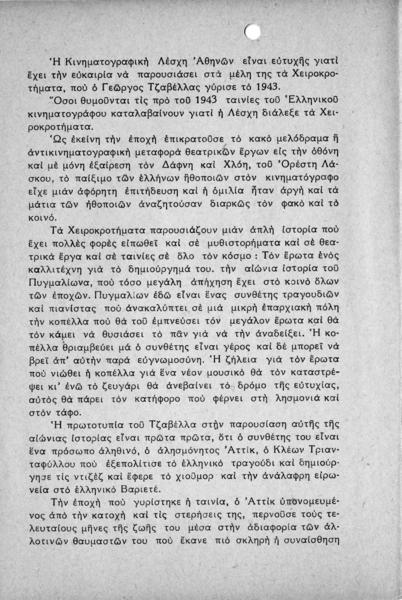 Σο πρόγραμμα για την προβολή της ταινίας "Χειροκροτήματα" αναφέρονται: ο πρώιμος ελληνικός κινηματογράφος και οι αδυναμίες του, η αξία της συγκεκριμένης ταινίας και το γεγονός ότι είναι παραλλαγή του μύθου του Πυγμαλίωνα, η πολύ καλή επιλογή του Αττίκ για τον πρωταγωνιστικό ρόλο, αφού ο συνθέτης ήταν στην πραγματικότητα στην ίδια κατάσταση με τον βασικό χαρακτήρα. Ακολουθούν βιογραφικά στοιχεία για τον σκηνοθέτη και δίνονται πληροφορίες για την παραγωγή της ταινίας. Τέλος, παρατίθενται άλλες ταινίες του Τζαβέλλα.