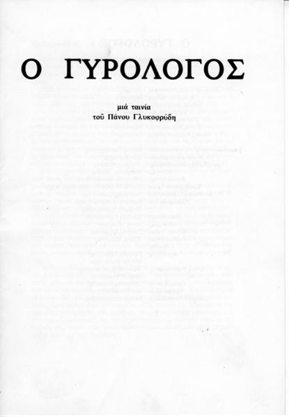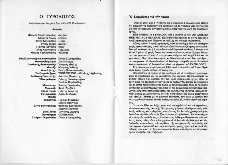 Διαφημιστικό έντυπο για την ταινία "Ο γυρολόγος" του Πάνου Γλυκοφρύδη. Με λίγα λόγια για την ταινία, τους συντελεστές και τους ηθοποιούς.