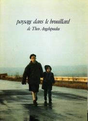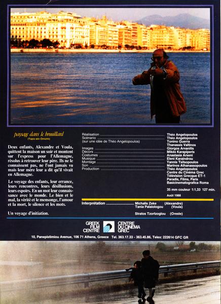 Διαφημιστικό έντυπο για την ταινία "Τοπίο στην ομίχλη" του Θόδωρου Αγγελόπουλου, στα γαλλικά με την υπόθεση του έργου, τους συντελεστές της ταινίας και φωτογραφίες.