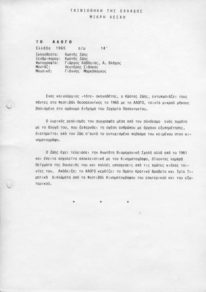 ΤΑΙΝΙΟΘΗΚΗ ΤΗΣ ΕΛΛΑΔΟΣ, ΜΙΚΡΗ ΛΕΣΧΗ (ΚΑΝΑΡΗ 1) - ΑΛΟΓΟ (ΤΟ)