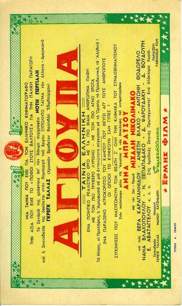 SMALL ADVERTISING POSTER OF GREGG TALLAS’ “AGIOUPA”, INDICATING THE FILMING CREW AND CAST